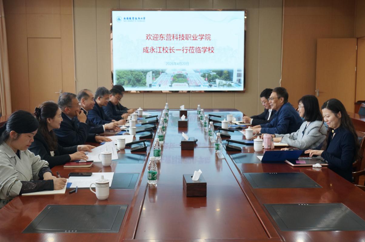 4月20日下午,东营科技职业学院校长成永江一行来校调研。我校校长周桂瑾、纪委书记李衔出席接待,质控部、双高办、双创学院、制造研究院以及党校办负责人参加座谈交流会。