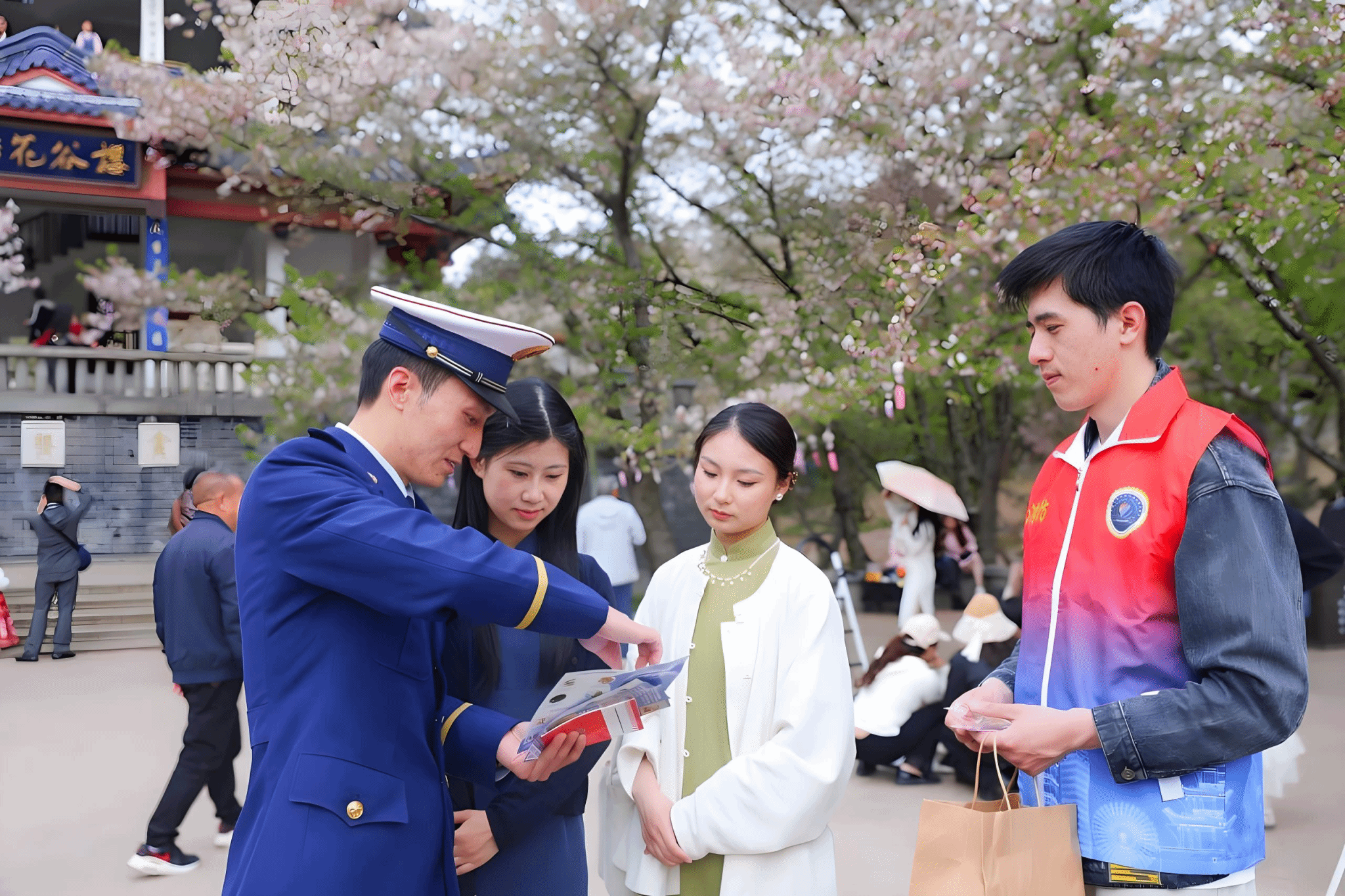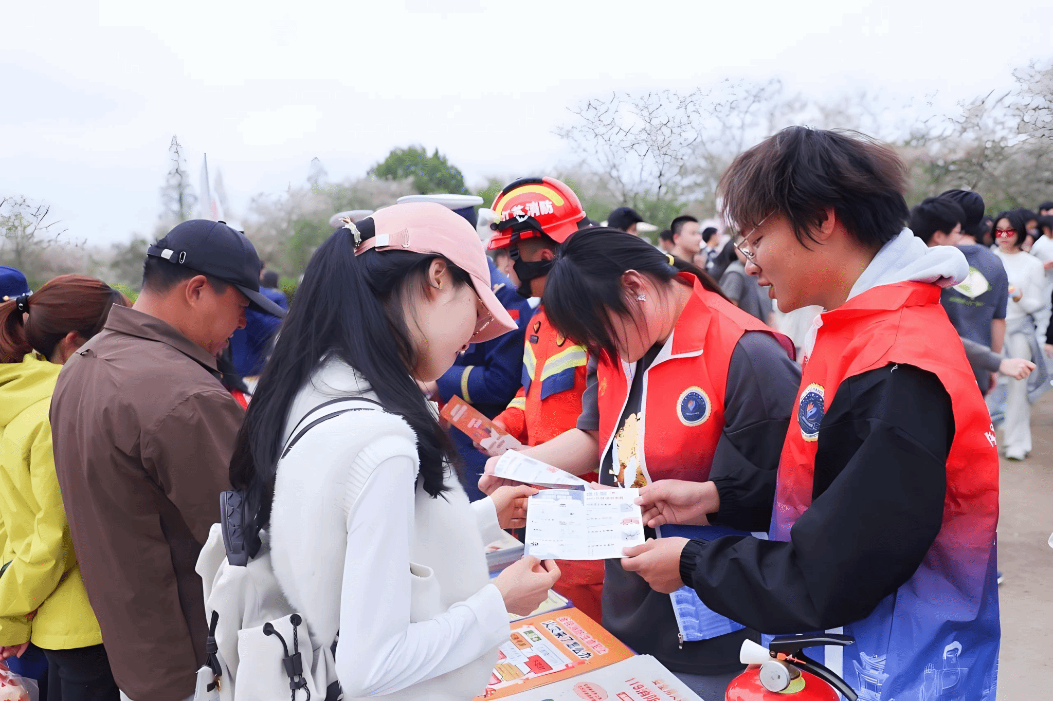 活动紧扣鼋头渚樱花季特色,将消防宣传与赏樱场景深度融合。在樱花谷宣传点,志愿者开设“樱花树下微课堂”,讲解春季防火、初期火灾扑救及火场逃生自救常识,现场演示干粉灭火器、过滤式逃生面罩使用方法,手把手指导游客实操。咨询服务区中,志愿者耐心解答游客家庭用火用电用气疑问。打卡集章区设置“平安樱愿墙”,游客写下安全心愿、与主题展板合影,让安全知识在浪漫花海中入脑入心。在消防部门专业指导下,师生流动宣传小队沿赏樱主干道、观景平台巡回宣传,及时劝阻违规吸烟、占用消防通道等行为,并向沿途商铺普及消防安全规范,实现“赏樱路线走到哪里,安全宣传就跟到哪里”。