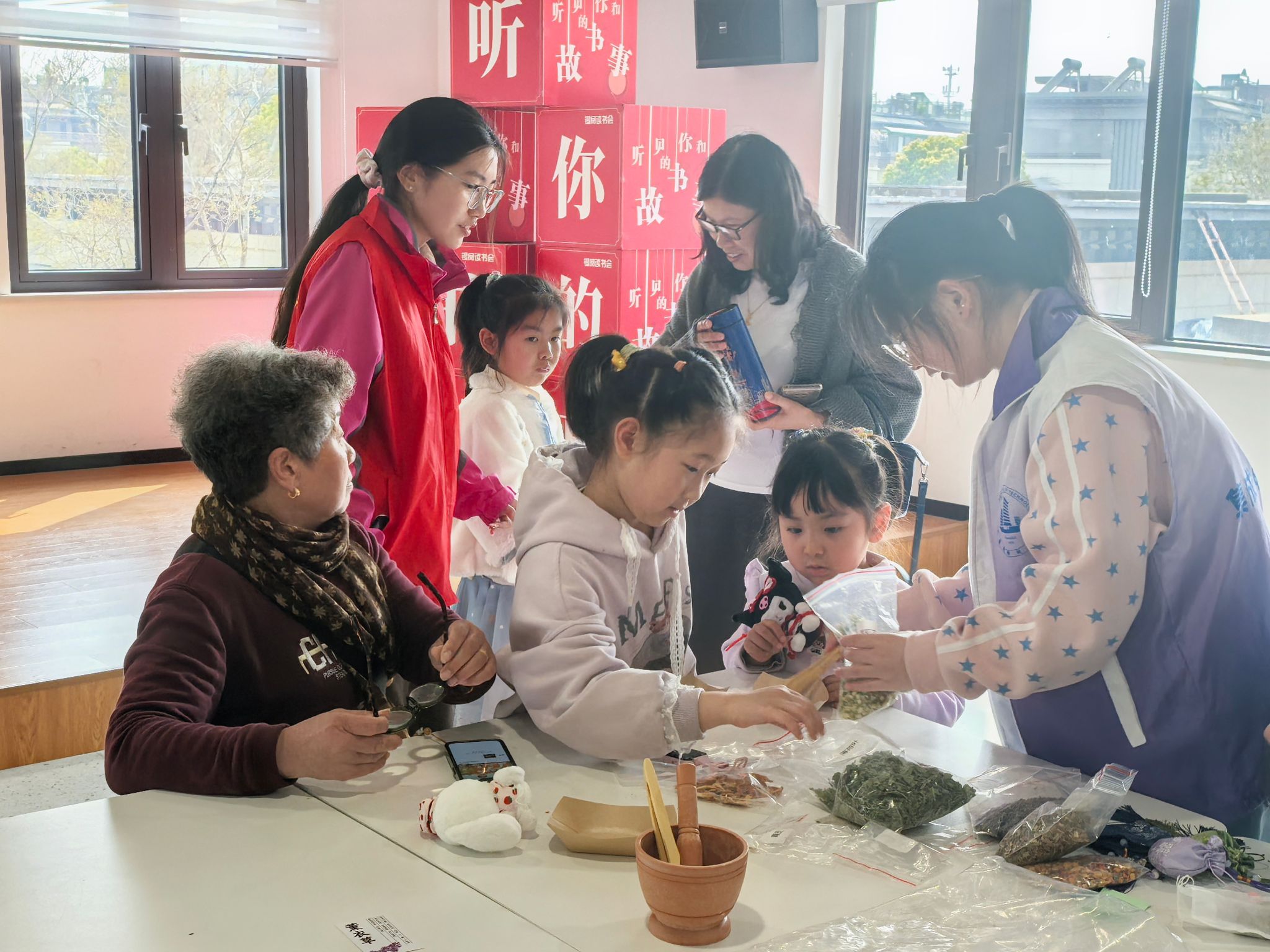 活动以清明节文化内涵为核心,专为55岁以上老人与6-12岁青少年组成的隔代家庭设计,设置了习俗共忆、祖孙共作、寄语留影三大环节,志愿者全程分组引导协助,让现场氛围温馨又热烈。在“指尖清明·习俗共忆”环节,志愿者带领大家开启代际文化对话,老人们娓娓道来儿时扫墓、踏青、插柳、吃青团的清明记忆,孩子们踊跃分享校园里学到的清明节气知识,两代人在交流中碰撞共鸣;随后的清明知识小竞答,祖孙同心协力答题,在轻松的比拼中加深了对清明传统的理解。“指尖传情·祖孙共作”环节成为本次活动的亮点,祖孙携手体验清明香囊DIY,志愿者现场讲解艾草、白芷、丁香等中药材的养生寓意,一件件承载着祈福安康美好心愿的香囊在默契合作中成型。紧随其后的数字记录教学环节,更是架起了传统文化与现代科技的桥梁,志愿者手把手指导祖孙合作使用手机拍摄手作过程,教授“豆包”“剪映”等软件的“一键成片”功能,由孩子当起小老师,帮助老人跨越“数字鸿沟”,用镜头定格温馨瞬间。