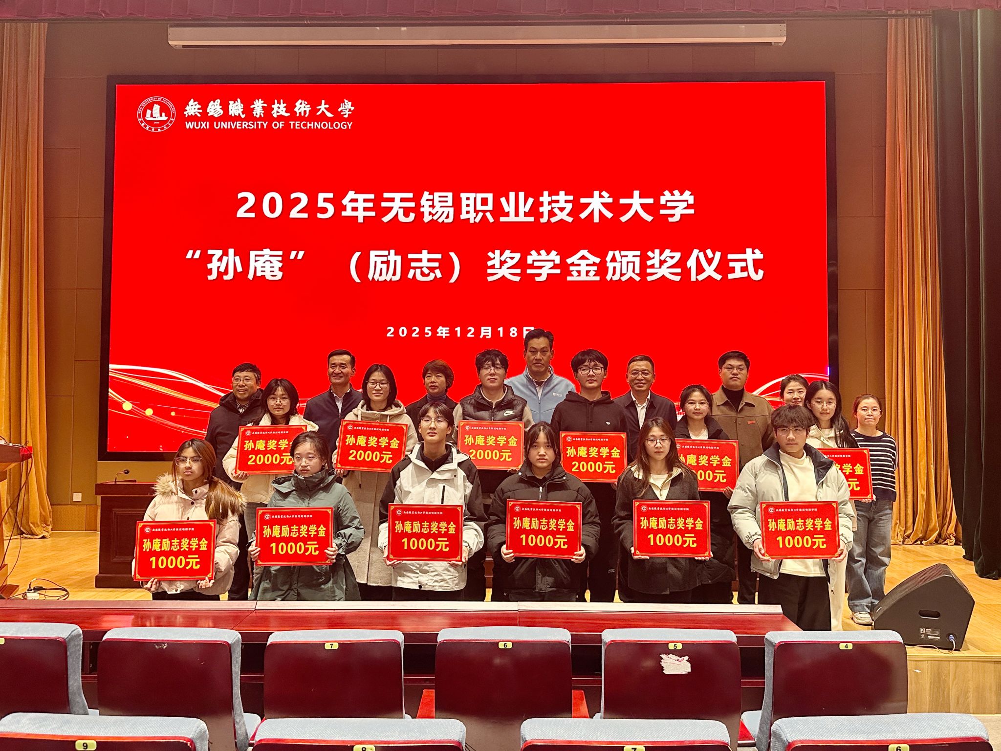 12月18日下午,学校2025年“孙庵”奖学金颁奖仪式在厚德楼一楼报告厅举行。无锡星友包装材料有限公司董事长、仪表911班校友张太友,副校长储开峰,学生处、招就处、集成电路学院相关负责人出席仪式。获奖学生代表、师生代表共同参加了此次活动。