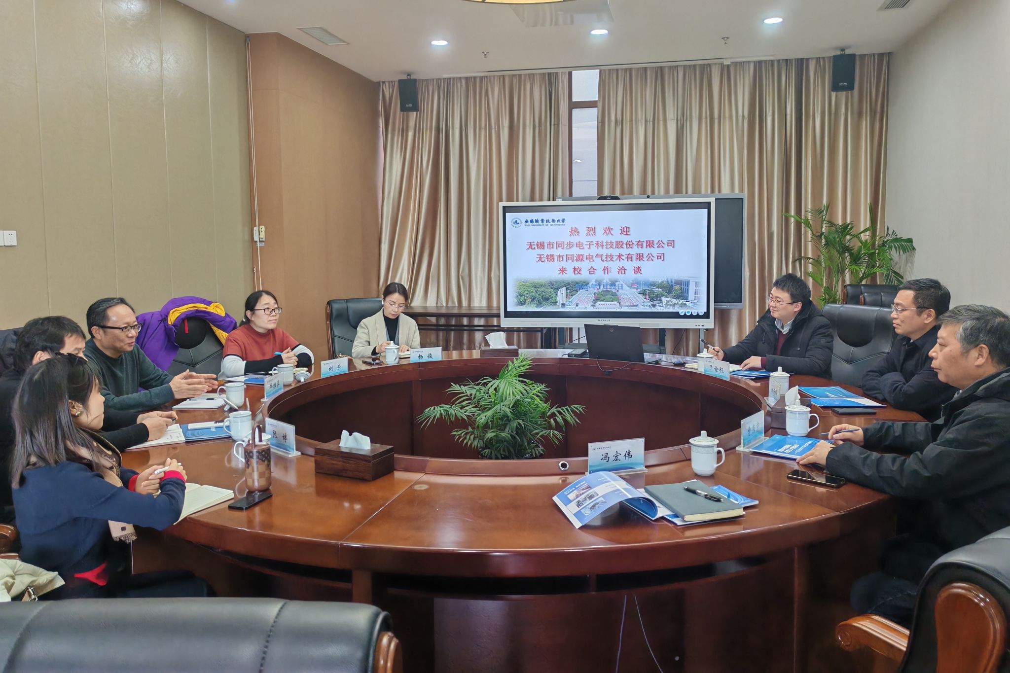 1月22日下午,无锡同步科技、无锡同源电气企业负责人华总、潘总一行莅临我校。我校副校长储开峰、科产处、控制工程学院相关负责人参与校企合作研讨交流活动。