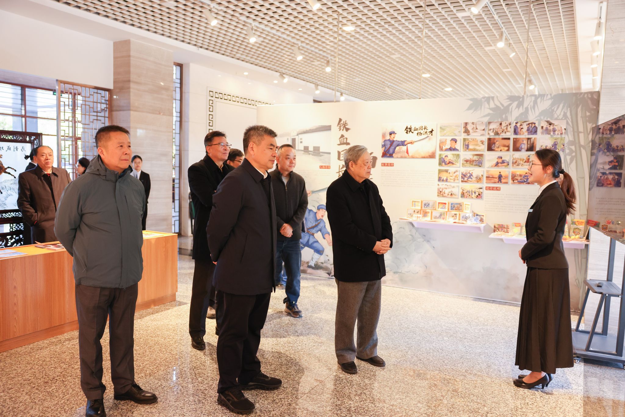 调研组先后前往图书馆三楼承泽书院与设计艺术学院展开实地走访。承泽书苑的图书、书架及字画均来自社会各界人士的捐赠,其中图书主要为储江、施平、陈德钧等革命前辈的遗藏,以及无锡市新四军研究会的捐赠。承泽书苑时刻提醒着每一位师生:这里的资源凝聚着社会各界尤其是革命前辈们的深沉恩泽。在设计艺术学院,调研组参观了学生红色主题作品展。展览聚焦无锡新四军纪念场馆中的抗战文化资源,深入挖掘其中的典型人物与事件,以青春视角为切入点,运用专业的艺术设计语言与创作理念,设计开发出红色绘本、红色动画、红色文创等艺术作品。同时,展览借助VR、AR、MR、AI等前沿技术,将场馆中的红色故事转化为青年大学生可感知、可参与、可学习、可传播的视觉文本,激励新时代大学生在铭记历史中赓续红色血脉,在砥砺前行中勇担时代使命,让跨越时空的抗战精神薪火相传。调研组对学校紧扣职业院校特色,打造专属关工阵地、推动工作下沉一线、贴近学生的务实做法给予了肯定。