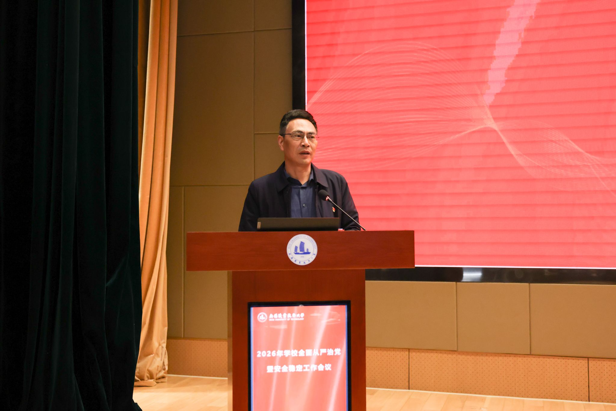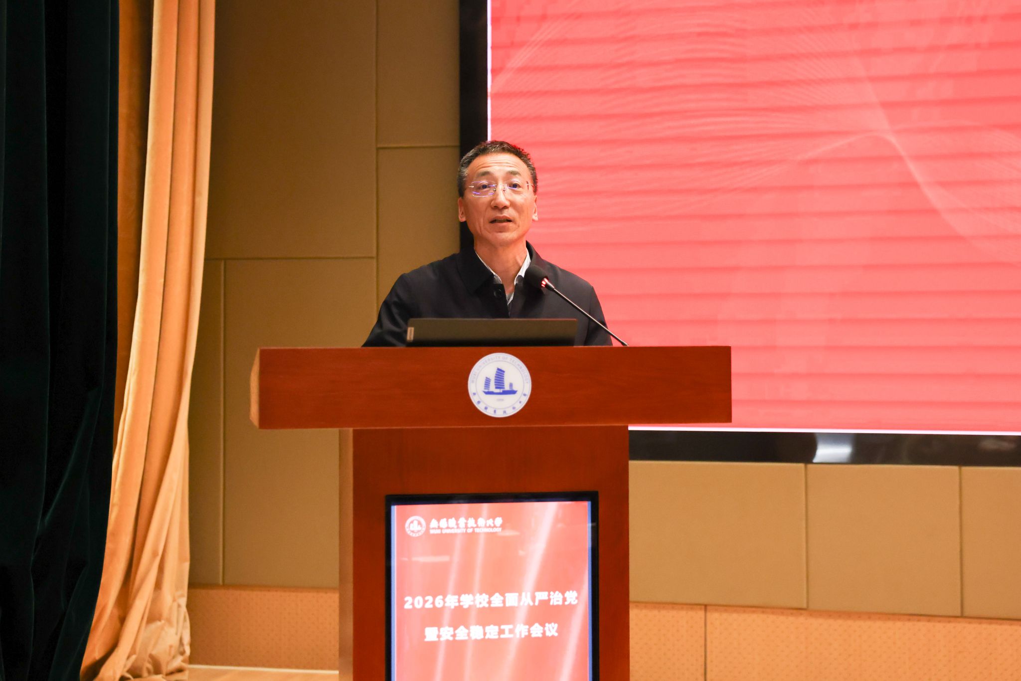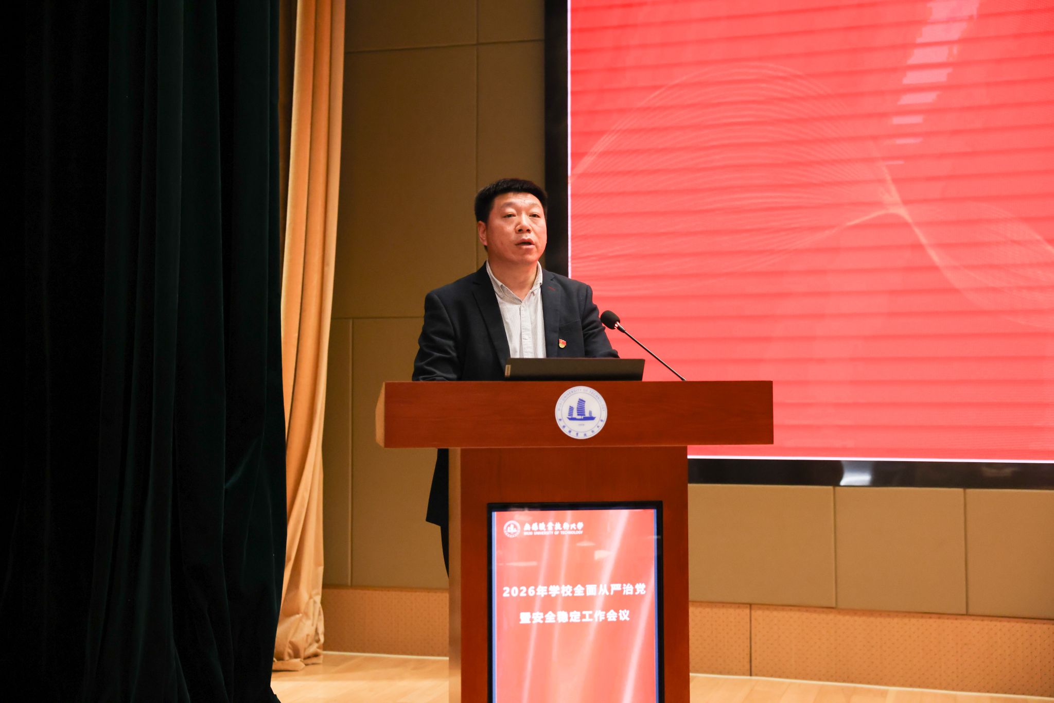 为深入学习贯彻党的二十届四中全会精神,全面落实党中央和省委关于全面从严治党的新部署、新要求,系统总结校园安全稳定工作成效,扎实推进巡视整改各项任务,3月26日下午,学校在厚德楼一楼报告厅召开2026年全面从严治党暨安全稳定工作会议。全体校领导、中层干部、校纪委委员、各二级党组织纪检委员、校安全联络员参加会议。会议由校纪委书记李衔主持。