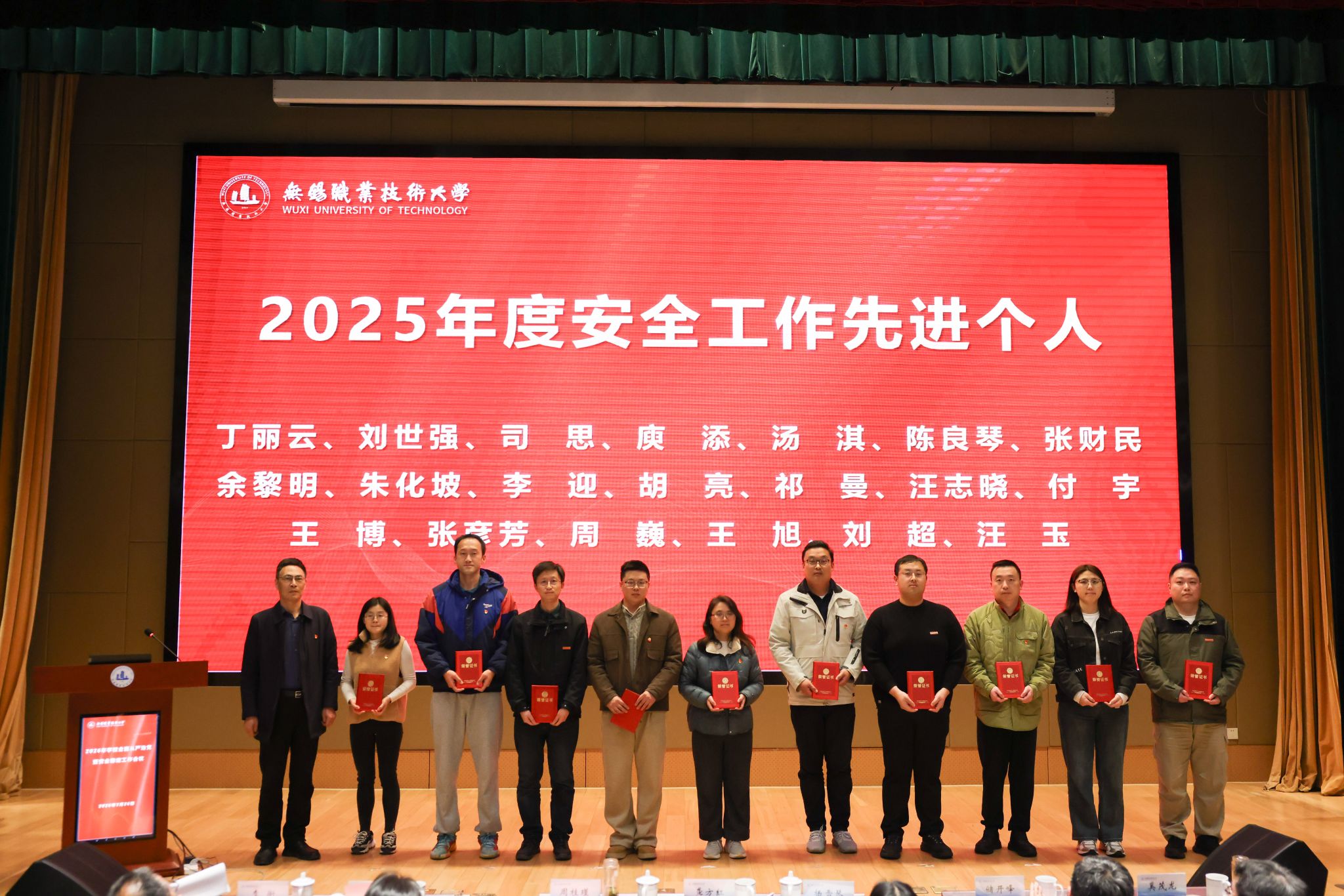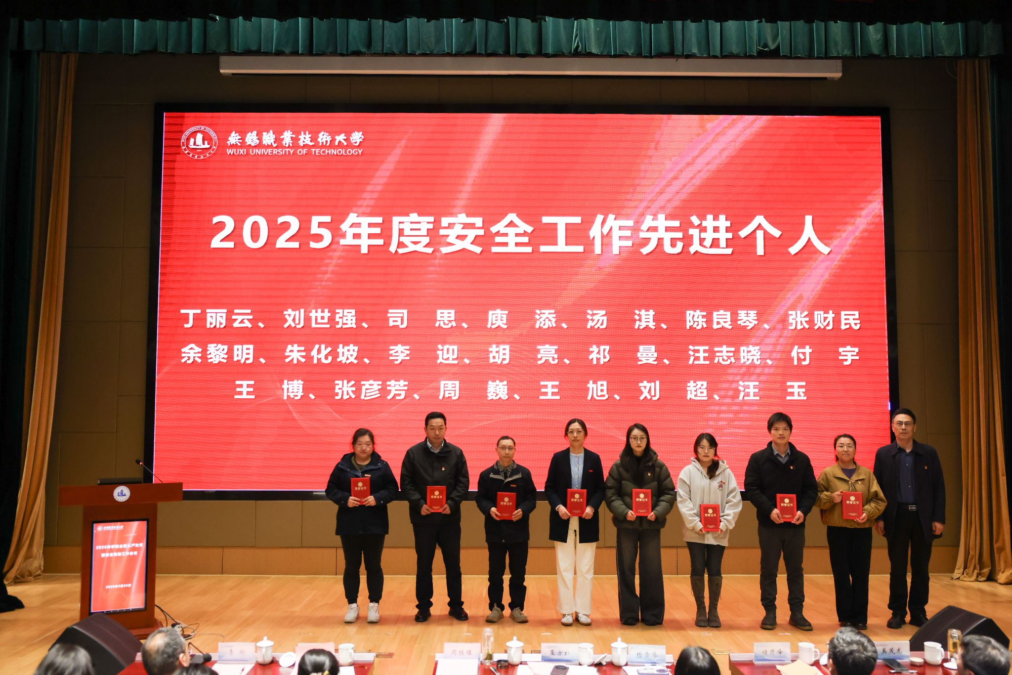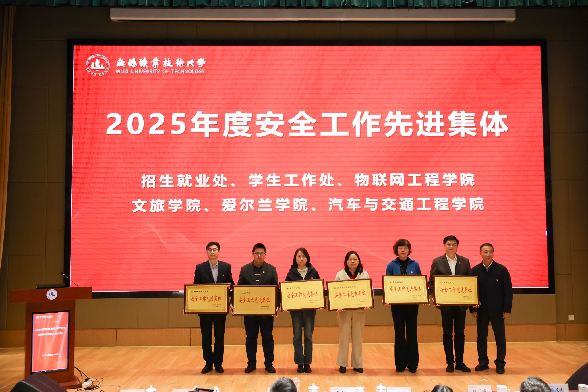 会议对2025年度学校安全工作先进集体和先进个人进行了表彰,校党委副书记杨雪琴宣读表彰文件。招生就业处、学生工作处、物联网工程学院、文旅学院、爱尔兰学院、汽车与交通工程学院等6个单位获评“2025年度安全工作先进集体”;丁丽云、刘世强等20位同志获评“2025年度安全工作先进个人”。校领导分别为获奖集体和个人颁发了荣誉证书和奖牌。