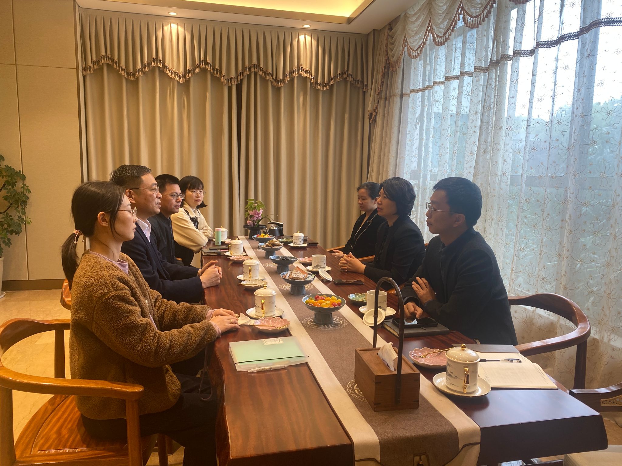 座谈会上,范艳霞详细介绍了酒店主营业务、发展规划、人才需求,希望进一步在人才培养、社会培训等方面扩大合作规模、拓展合作深度。储开峰指出,深化产教融合是旅游类专业人才培养的重要抓手,希望双方以此次走访为契机,建立常态化沟通机制。一是优化学生实习实训管理模式,提升学生职业素养与实操能力;二是共同开发贴近文旅行业发展实际的课程资源与实训项目,实现教学内容与岗位标准对接;三是探索联合科研与社会服务,形成优势互补、互利共赢的合作新局面。