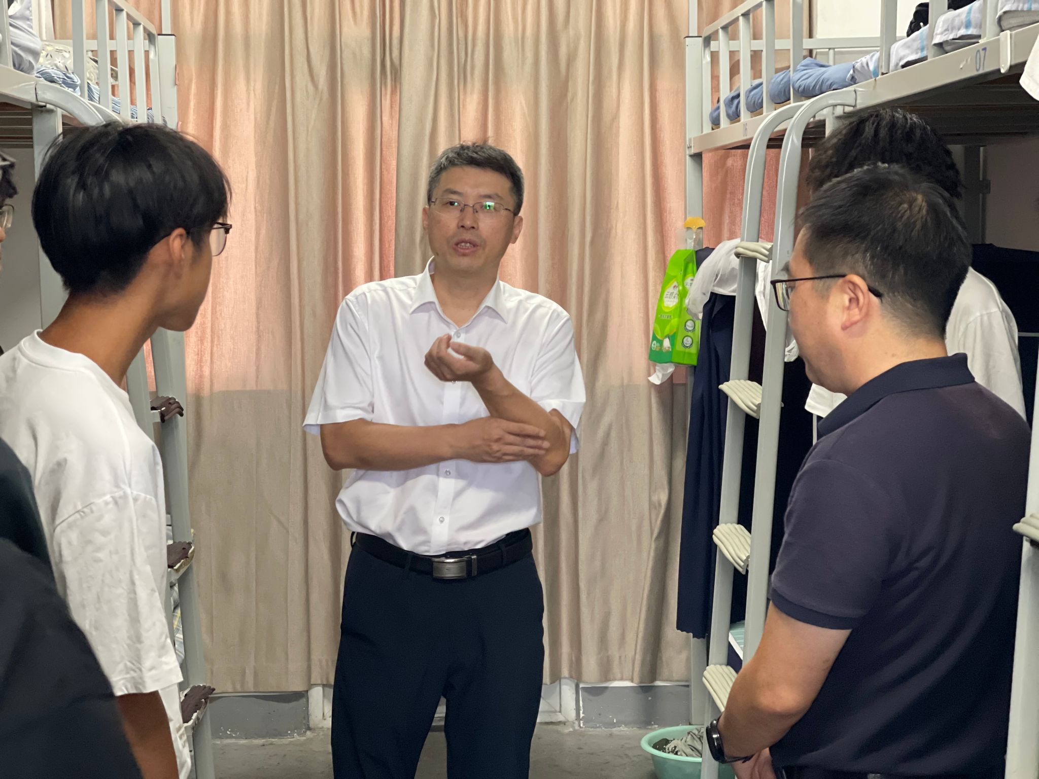 国庆、中秋双节将至,副校长奚茂龙率队赴学生宿舍走访慰问,机械工程学院相关负责人陪同走访。