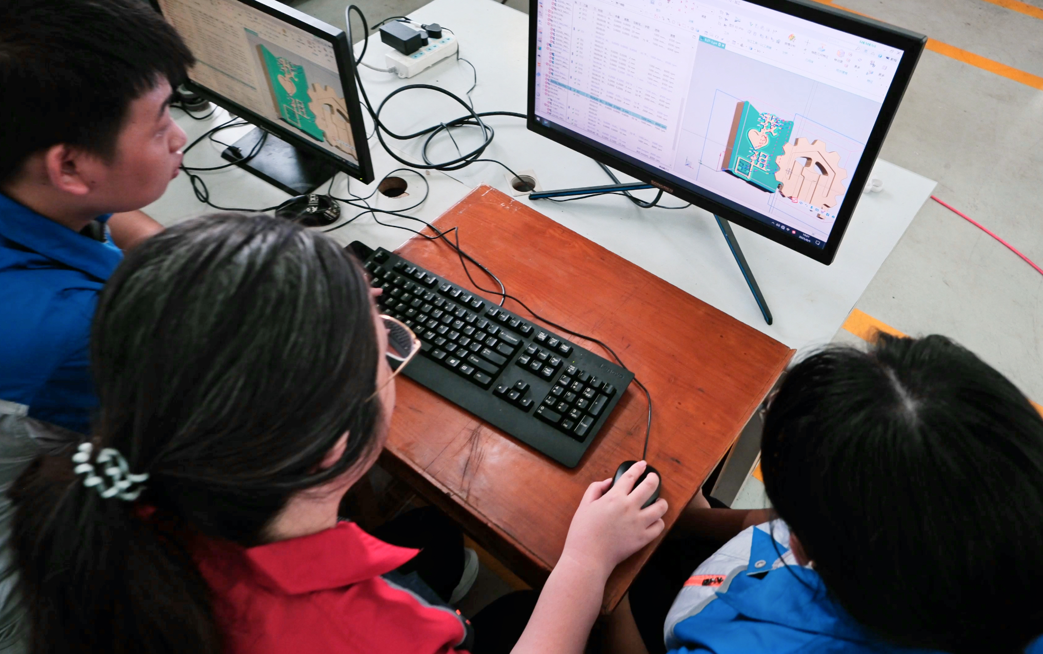 精雕细琢,铸就爱国丰碑。在学院的模具加工中心,学生马俊杰正全神贯注地操作着精密机床,随着铣刀在铝材上精准地游走,一座微缩而庄严的“天安门”模型逐渐显现出清晰的轮廓。每一个棱角,每一处细节,都凝聚着他对技艺的追求和对祖国的热爱。项目成员们表示“选择‘天安门’,是因为它是祖国的象征”“我想用我们机械人最擅长的切削加工,将这块坚实的铝锭,变成我心中最伟大的建筑。”与此同时,专业教师李薇运用三维建模技术,将“我爱祖国”这一深情告白与学院的徽标巧妙地融合在一起,通过精密加工设备刻印在铝制底座上。从数字世界的精准建模到物理世界的切削雕琢,学院师生用不同的方式,共同完成了对爱国情怀最“硬核”的表达。