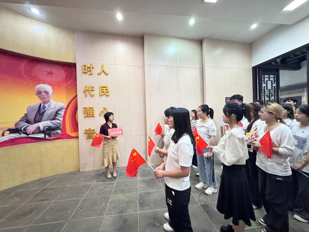 在王莘故居前,师生们挥舞着手中的国旗,一起唱响了“五星红旗迎风飘扬,胜利歌声多么响亮……”体会着这首歌中对祖国母亲的热爱和对党带领中国走向复兴的信心。与此同时,学院还将“经纬课堂”搬到了活动现场,在学院党总支书记徐瑾的讲解下,师生实地参观王莘故居,重温红色历史,在图片、文物与故事中感受到《歌唱祖国》所蕴含的浓烈民族精神,体会先辈无私奉献的赤子之心。