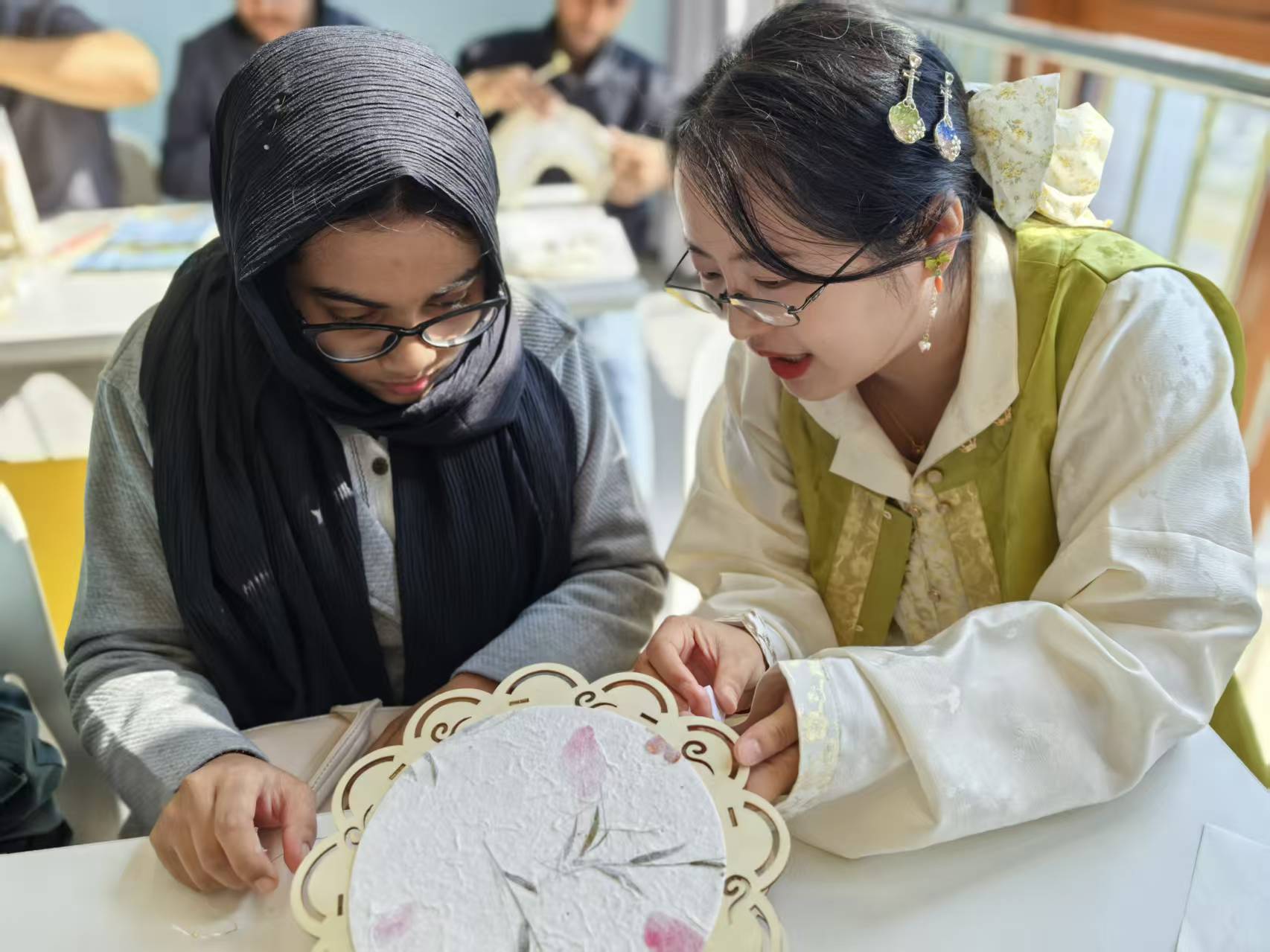 活动在轻柔的中国传统音乐中拉开帷幕。破冰环节的“光影接龙”迅速拉近了彼此距离。在了解灯笼承载的“团圆与希望”文化寓意后,同学们在老师的引导下进入专注的创作阶段。裁剪宣纸、描绘图案、组装灯架,指尖的细致操作成为凝聚注意力的“正念练习”。随着一盏盏独具特色的灯笼渐次成型,活动迎来了最动人的“点亮仪式”——室内灯光暗下,四十盏手工灯笼同时亮起,温暖的光芒瞬间照亮了整个空间,也映照出同学们惊喜与感动的脸庞。在随后的分享中,巴基斯坦学生艾哈迈德动情地说:“这盏灯让我想起了家乡的节日,虽然远离家人,但在这里我感受到了同样的温暖。”杨意健同学则表示:“教国际同学做灯笼的过程,让我对传统文化有了新的理解。”