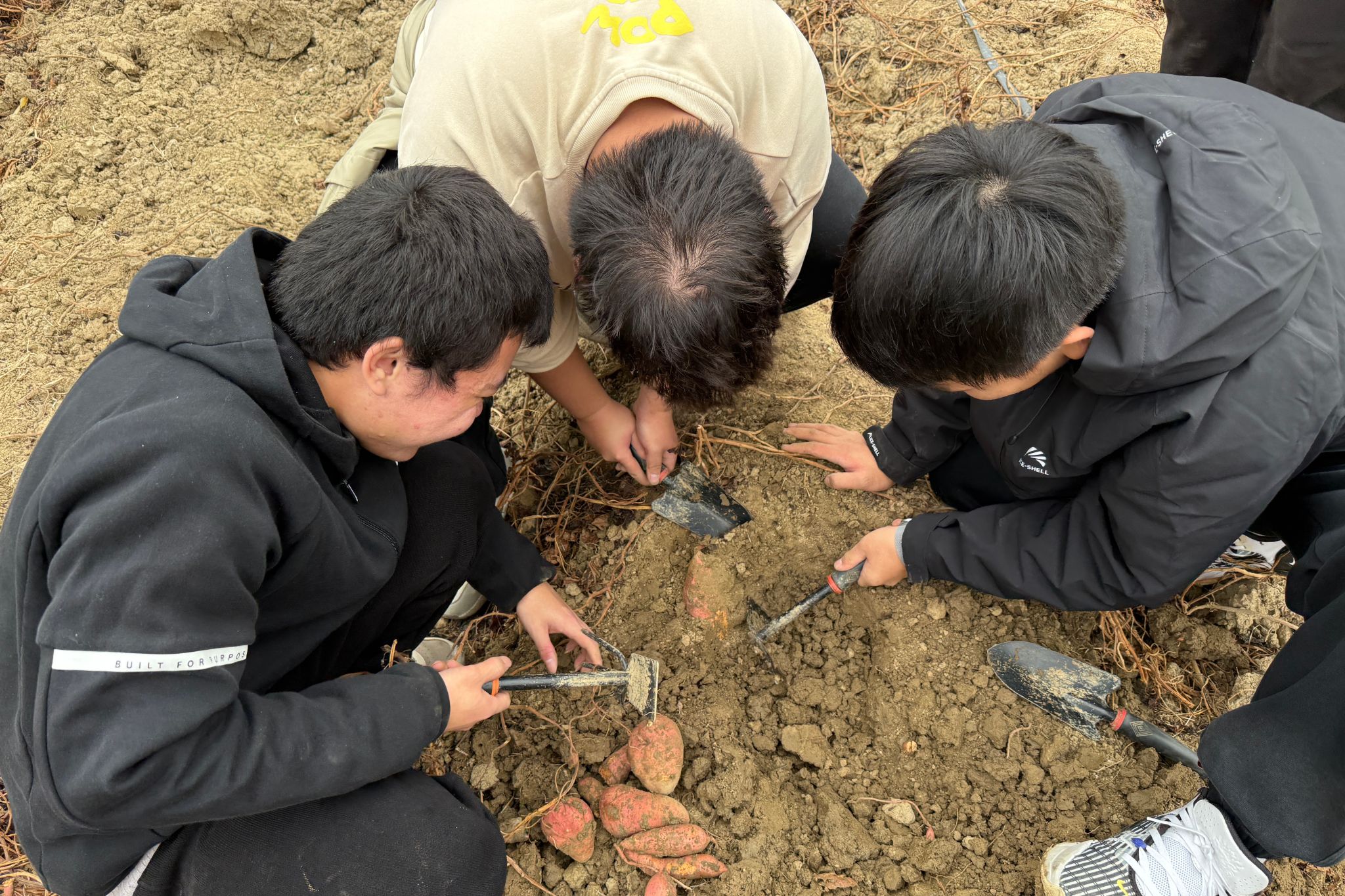 活动以“信任人椅”“爱的拥抱”等互动式设计破冰,快速构建协作基础,为后续环节筑牢团队根基。核心环节聚焦劳动教育本质,通过挖红薯的田间实践任务,让同学们在分工协作中体悟劳动价值,在实践磨砺中强化责任意识,实现体力付出与精神成长的同步推进。之后,同学们将红薯烤熟,在冬至将至之时,分享了甜蜜与喜悦。“虽然离家很远,但是在学校也感受着像家一样的温暖,同学和老师给了我很多宝贵的人生体验”少数民族学生英卡尔说。
