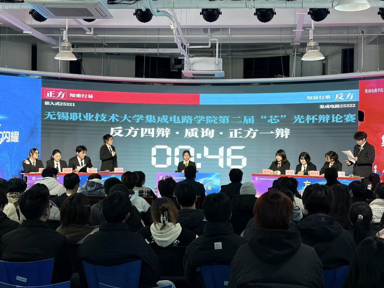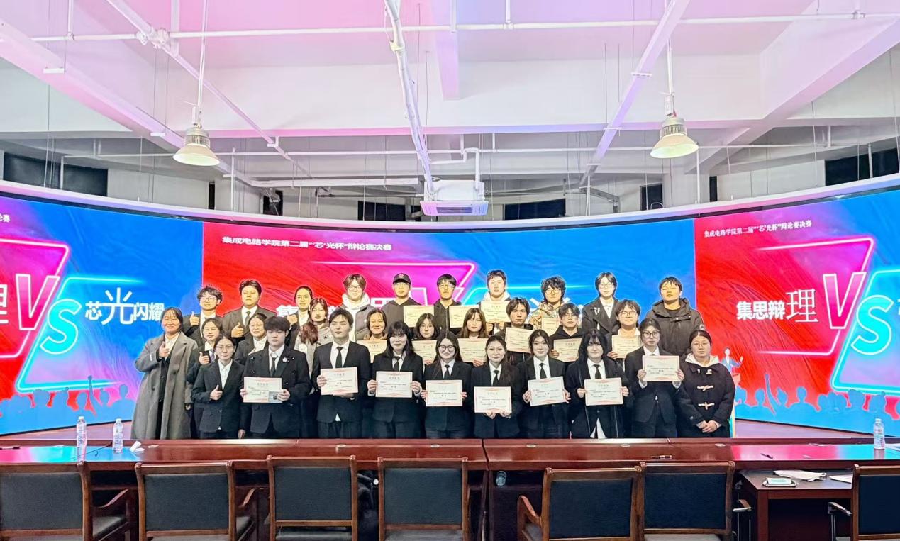 为活跃校园文化氛围,提高同学们的语言表达能力,12月26日,以“集思辩理,芯光闪耀”为主题的集成电路学院第二届“芯光杯”辩论赛决赛成功举办。本次赛事从11月开始,历经初赛、复赛、半决赛的多轮精彩角逐,最终由嵌入式25321班(正方)与集成电路25322班(反方)两支代表队脱颖而出,会师决赛,围绕“知难行易”与“知易行难”的辩题展开了一场逻辑与智慧交锋的视听盛宴,学院党总支书记、辅导员以及木樨辩论社同学共同参加。