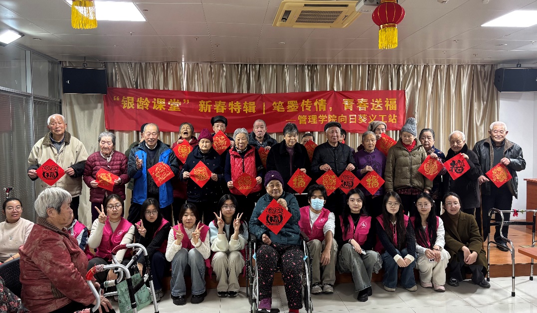 新春将至,年味渐浓。为传承中华优秀传统民俗文化,践行关爱老年群体的社会责任,1月15日下午,管理学院向日葵义工站师生志愿者走进新安养老服务中心,开展“‘银龄课堂’新春特辑|笔墨传情,青春送福”福字拓印活动,以传统技艺为载体,为老人们送上满满的新春暖意与美好祝福。