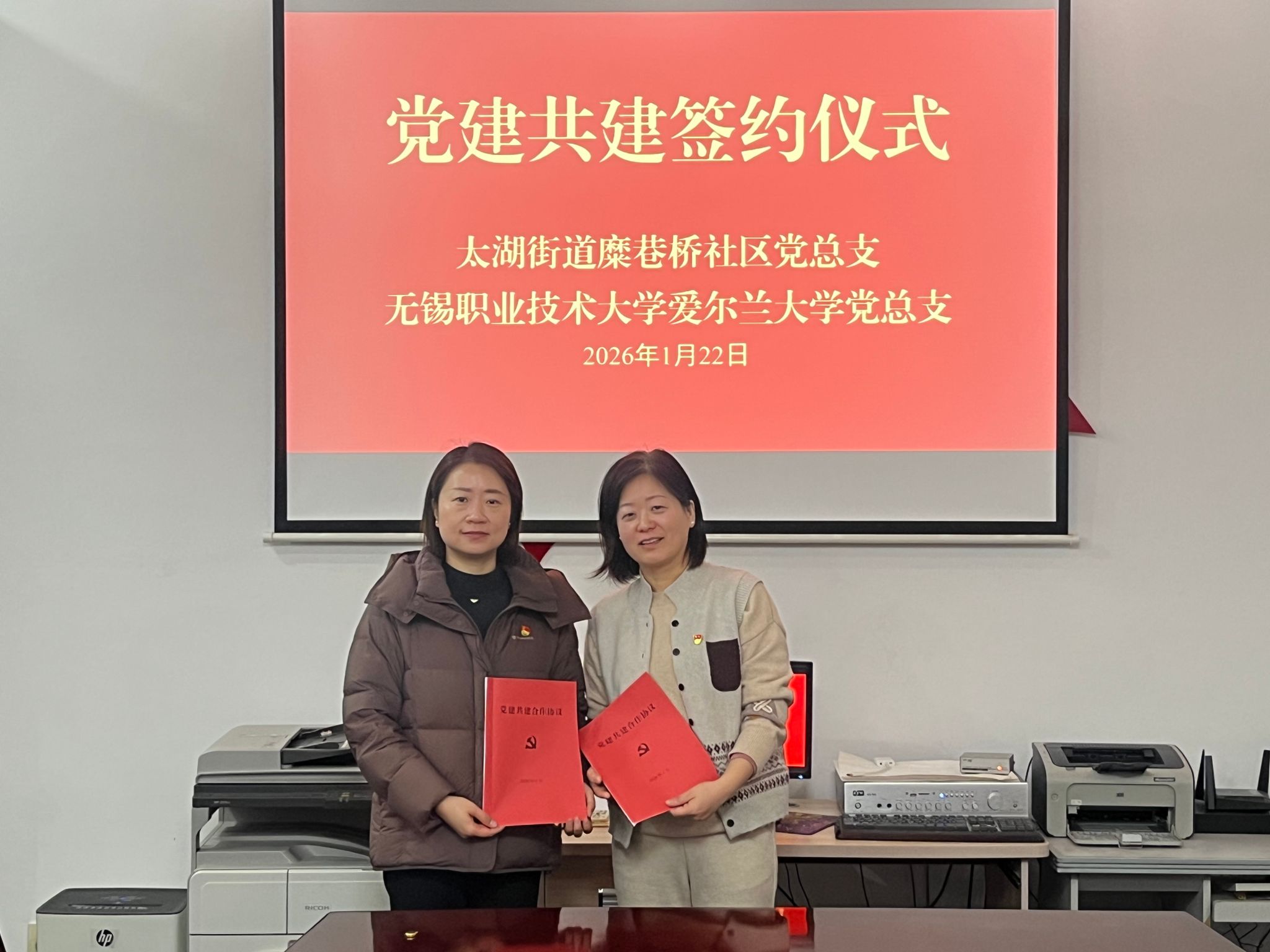 为深化基层党组织建设,探索校社联动、资源共享的党建新路径,1月22日上午,爱尔兰学院党总支、机械工程学院教师第一党支部与无锡市糜巷桥社区党总支在社区党群服务中心举行党建共建签约仪式。社区党总支书记唐小平、副书记沈玉婷,爱尔兰学院党总支书记李湘、副院长孙台维,机械工程学院教师第一党支部书记苗盈出席活动。