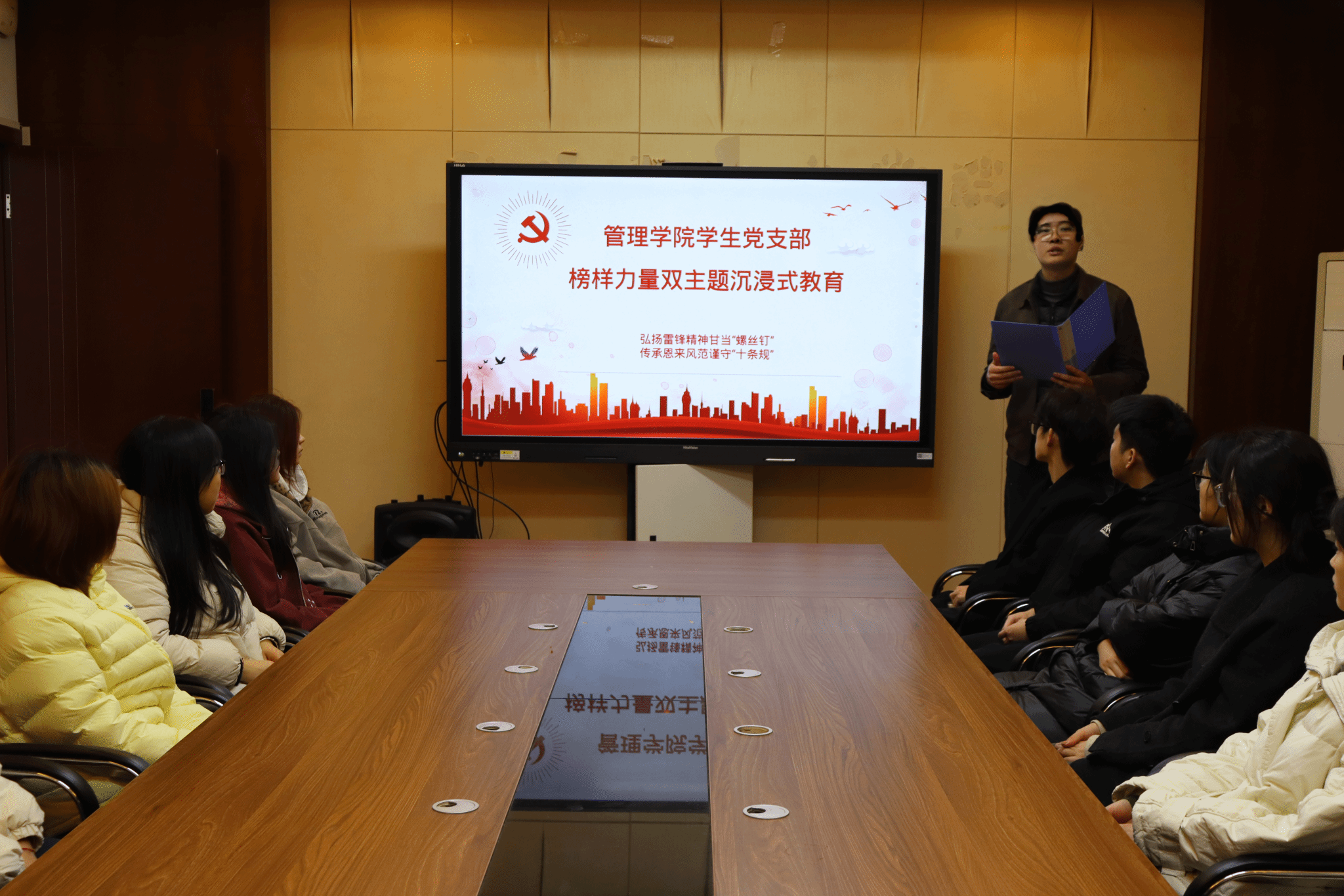为纪念周恩来同志诞辰128周年与第63个“学雷锋纪念日”,3月3日下午,管理学院学生党支部在明德楼J1-315会议室组织召开《榜样力量》双主题沉浸式教育学习活动。