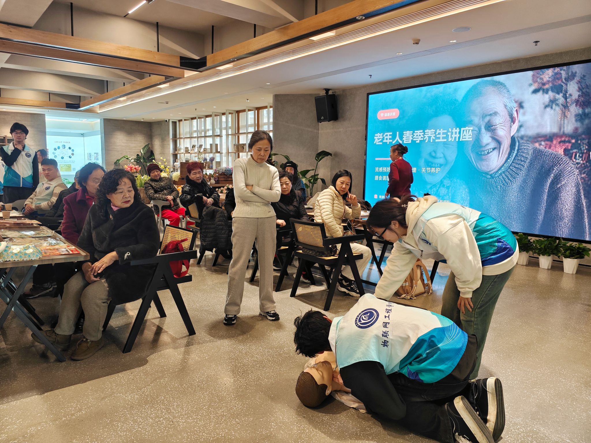 结合春季时令特点,关工委老同志陶惠良围绕流感预防、高血压管理、关节保健等内容,讲解春季常见疾病的预防与日常调理方法,并推荐适合老年人的膳食搭配与运动方式。学生志愿者充分发挥专业优势,一对一指导老人使用智能手机查询节气养生知识、浏览健康科普视频,并演示如何通过微信小程序记录血压、步数等健康数据,帮助老人跨越“数字鸿沟”,在科技应用中感受便捷与温暖。