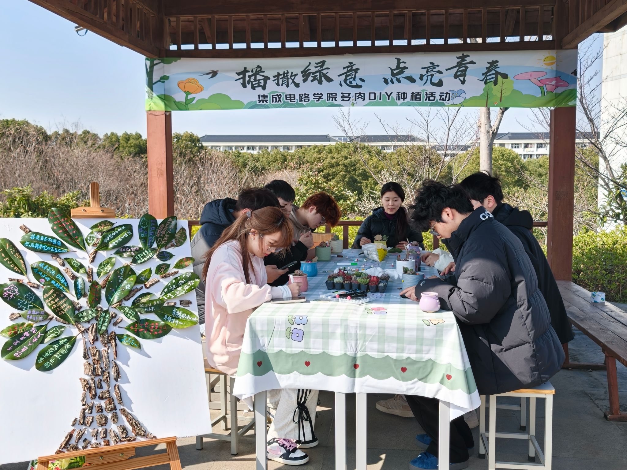 春芽破土生,绿意满庭芳。3月10日下午,集成电路学院举办“一站式”社区植树节主题教育活动。活动以“邀好友·种绿植·话友情”为主题,帮助学生在指尖耕耘绿意中舒缓压力,在默契协作中拉近心距。