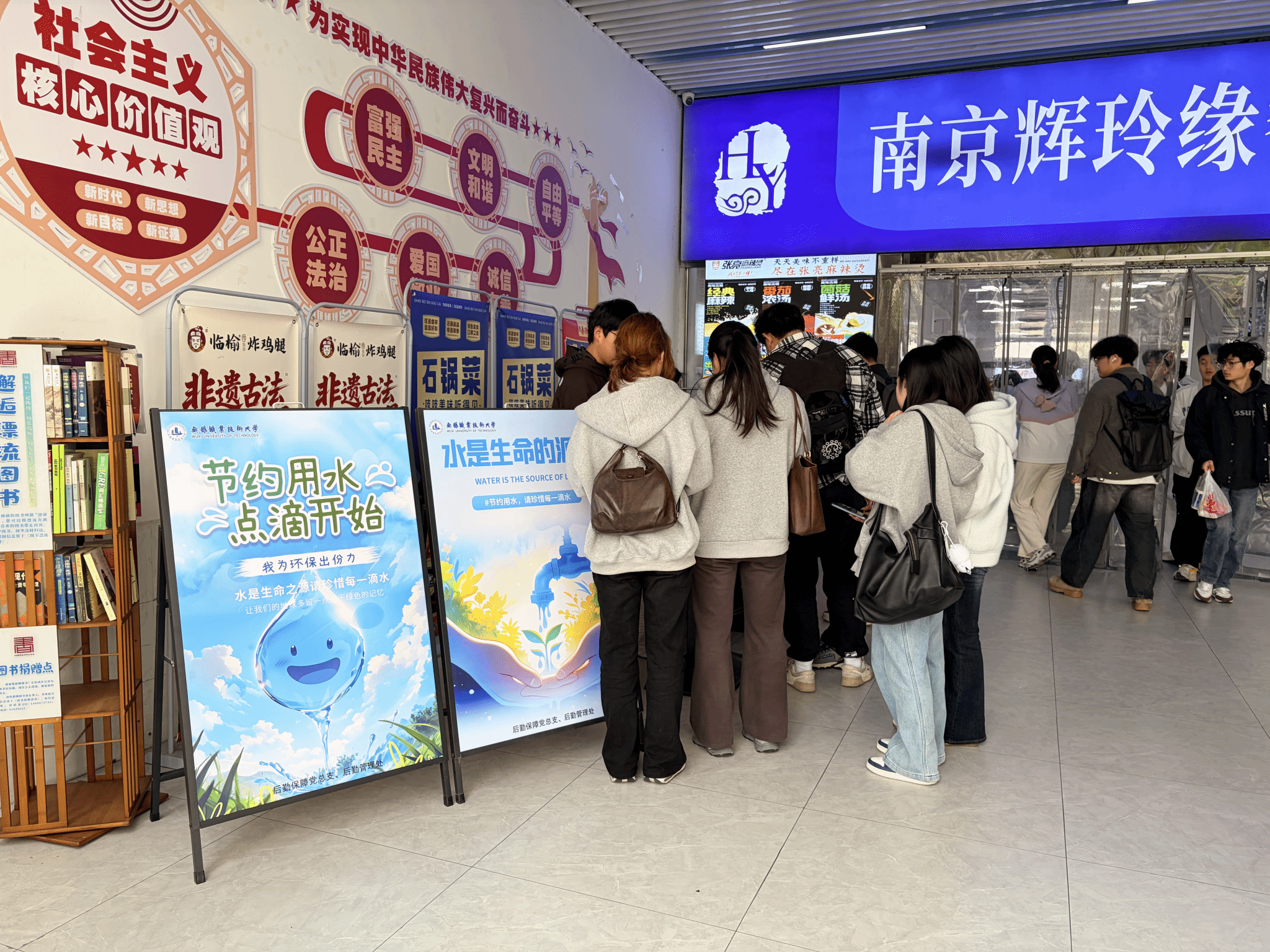 学校在食堂门口设立节水宣传主会场。活动现场悬挂着“纪念第三十四届‘世界水日’第三十九届‘中国水周’”“水是生命之源,请珍惜每一滴水”等主题横幅,色彩鲜明的宣传展板有序排列,吸引过往师生纷纷驻足。后勤保障处老师联合学生志愿者向师生发放节水知识宣传单,内容涵盖用水行为规范、水资源保护法律法规等,兼具知识性与实用性。