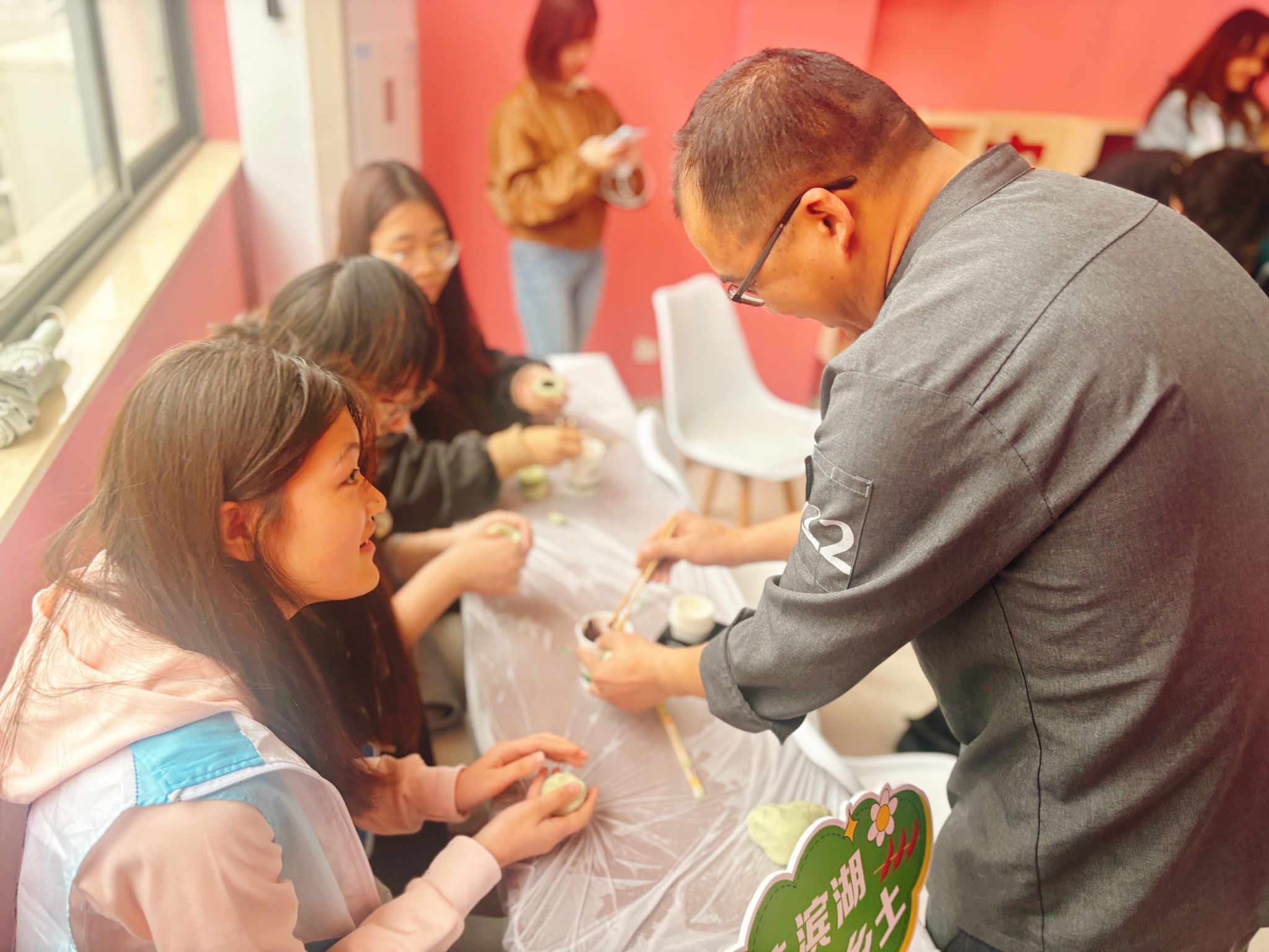 现场氛围热烈融洽,大家热情高涨、踊跃参与,纷纷动手尝试,揉面、包馅、搓圆,一系列动作娴熟有序,一个个色彩鲜绿、形态规整的青团陆续成型,欢声笑语间,暖意充盈整个活动现场。