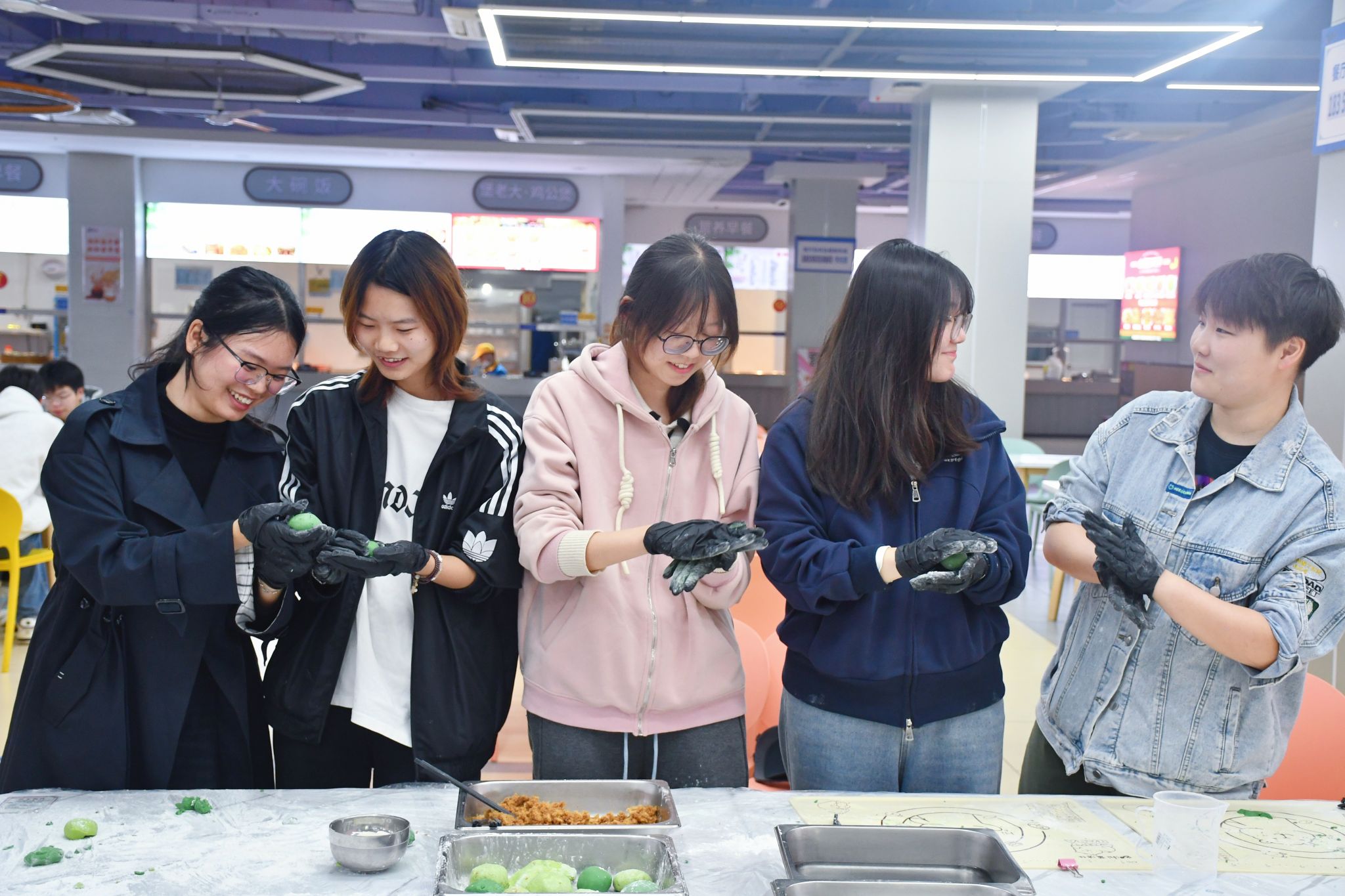 在轻松温馨的氛围中,龚方红与同学们一同揉面、包馅,分工协作、默契配合,一个个青翠饱满的青团逐渐成型。大家在亲手制作中触摸传统技艺、体会民俗温度,现场气氛热烈融洽。