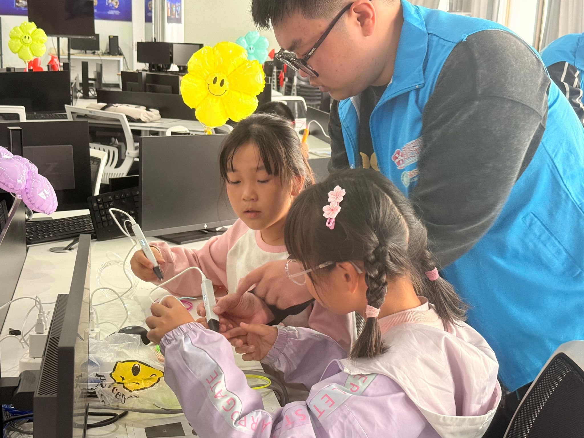 活动当天,机械学院VR实验室热闹非凡,孩子们的欢声笑语充盈其间。在3D打印体验区,学生志愿者以趣味科普切入,用通俗语言拆解技术原理,现场操作3D打印机进行全程演示,直观展示设备运行的全过程。与此同时,志愿者们还细致讲解了3D打印笔使用方法,引导孩子们上手实践。孩子们化身“小小设计师”,发挥想象力,用3D打印笔勾勒创意,当笔下线条堆叠成立体实物,眼中满是惊喜与自豪。“原来用一支笔就能画出立体小物件,太神奇了!”一名同学捧着作品,兴奋地与伙伴分享喜悦。