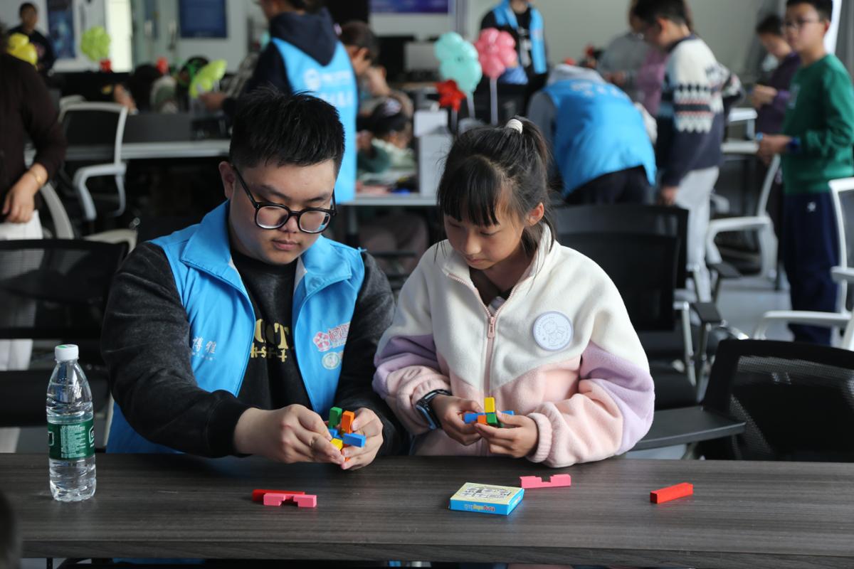 鲁班锁体验区同样人气高涨。作为中华传统木工瑰宝,鲁班锁承载着千年匠心。学生志愿者为孩子们讲述其历史与文化内涵,带领大家感受榫卯结构“无钉无胶、严丝合缝”的精妙,再手把手传授拆解与组装技巧。孩子们从手足无措到熟练操作,专注投入,当一个个精巧的鲁班锁成型,不仅锻炼了空间思维与动手能力,更让非遗文化在心中扎根。