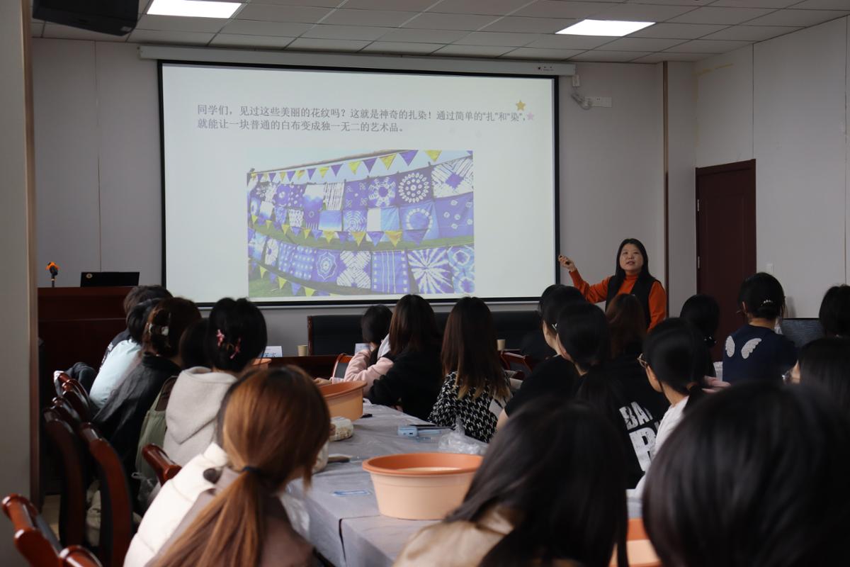 现场陶燕以“非遗扎染与环保同行”为主题,讲解扎染历史与文化内涵,演示捆扎、浸染、漂洗等核心步骤,重点介绍板蓝根染料的天然环保优势,让师生明白传统扎染亦是低碳可持续的生活方式。师生们挑选素白方巾,轻捏中心提起捏出褶皱,用皮筋紧密缠绕固定,随后将布团放入板蓝根染料中耐心浸染,不时翻动观察。漂洗后剪断皮筋,一块蓝白相间、纹样如烟火的方巾惊艳呈现。杨雪琴分享感悟:“扎得紧、染得匀,既是扎染匠心,也是人与自然相处的分寸感,唯有敬畏方能共生。”