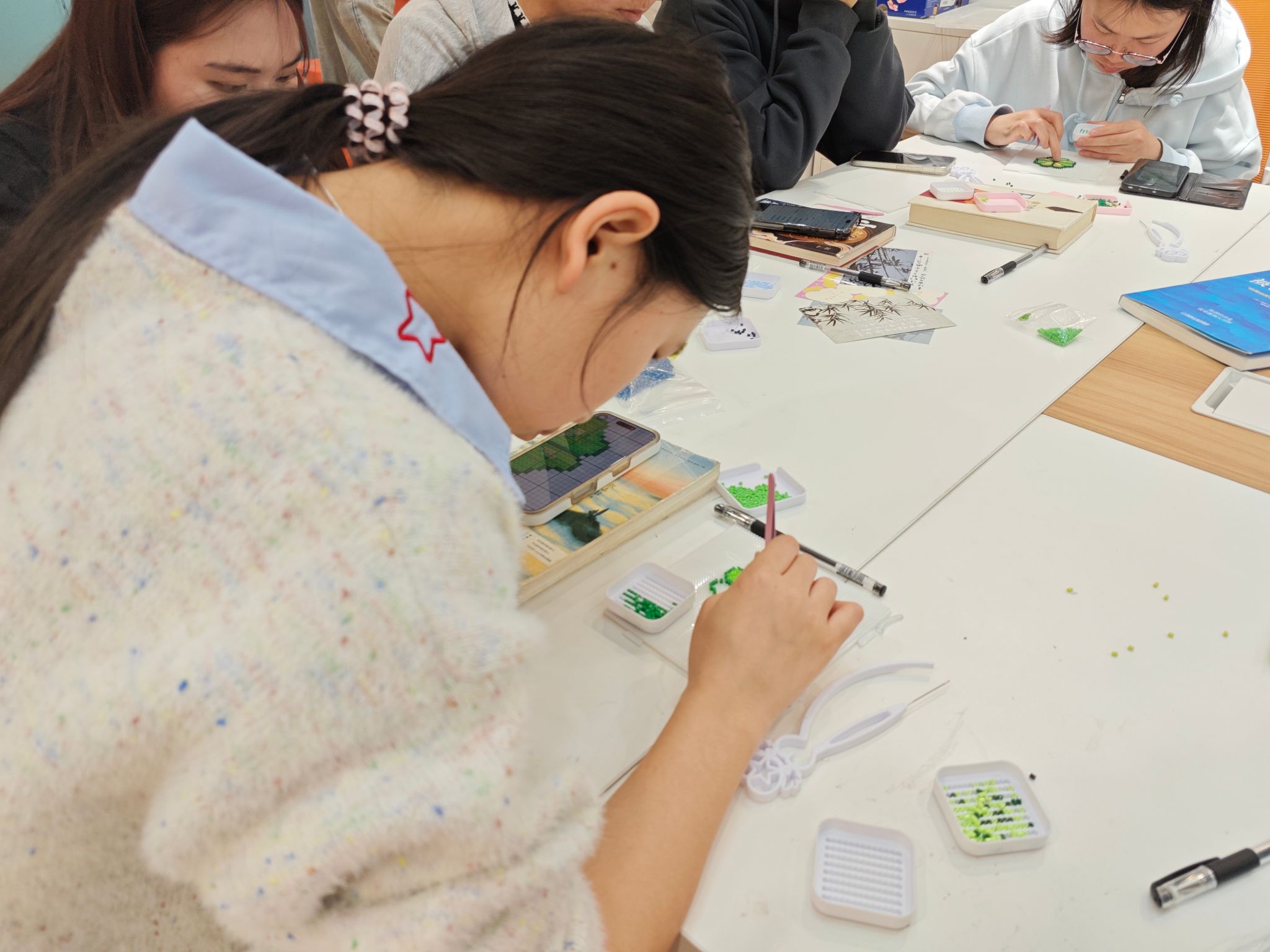 地球日主题环节中,学生们动手拼制地球、水滴、树木及可回收标志等图案,以实际行动呼应环保理念。随后开展“明信片寄语”活动,同学们在明信片上写下自己对地球的绿色承诺,表达保护环境的决心与责任。活动最后设置“绿色承诺墙”,学生在便签上写下“自带水杯”“少用一个塑料袋”等环保小贴士,粘贴于展板并合影留念。拼豆作品经评选后制作成钥匙扣或磁吸贴,供学生留存。
