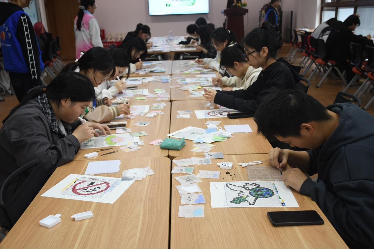 活动伊始,周桂瑾在致辞中指出,环保是全民责任,校园是环保教育的重要阵地,希望通过此次“环保+手工+育人”的特色活动,引导学生在实践中树立环保意识,争做绿色家园的守护者。现场精心准备了一系列世界地球日主题拼豆图纸,地球、和平鸽、大树、小草、春日繁花等元素栩栩如生,为同学们的创作提供灵感。周桂瑾与同学们亲切交流,共拼“地球”,同时耐心倾听同学们对环保理念的理解。欢声笑语间,一个个承载着环保期许的拼豆作品逐渐成型。