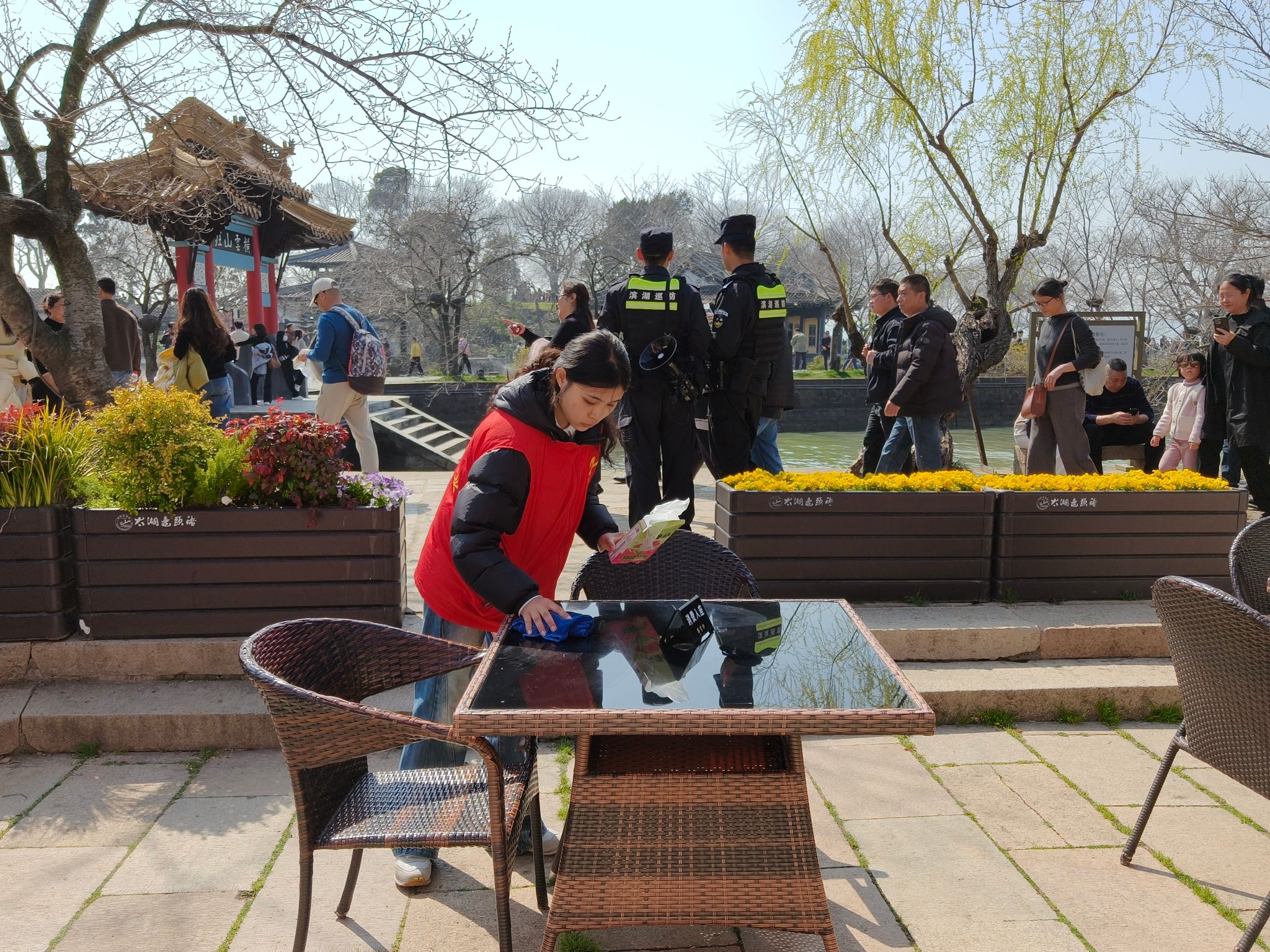“您好,请问樱花谷怎么走?”“麻烦帮我打印一下电子门票,谢谢!”在景区游客中心,志愿者们身着统一志愿服装,面带微笑接待每一位咨询的游客。作为景区服务的“第一窗口”,他们提前熟悉景区布局、赏樱路线、票务政策及周边交通信息,为老人、儿童、残疾人等特殊群体提供优先引导、轮椅协助等贴心服务,用细致服务化解游客的出行难题,让游客在赏樱之初便感受到温暖与便捷;商业服务岗位上的志愿者不仅能协助商户做好商品陈列,保持摊位整洁,更能主动为游客推荐无锡特色文创产品和本地小吃,耐心讲解产品背后的文化故事,助力外地游客更好地感受江南文化魅力;景点巡视岗位的志愿者们沿着樱花大道、太湖岸线、核心景点开展常态化巡视,一边提醒游客文明赏樱、有序拍照,一边密切关注游客动态,及时发现并协助排查景区安全隐患;码头管理岗位的志愿者们引导游客有序排队、检票登船、维护码头秩序,疏导上下船人流,避免拥挤踩踏;门票导购岗位上的志愿者协助游客通过线上平台购票、兑换电子门票,减少游客排队等候时间,同时向游客推荐最优赏樱路线,介绍景区特色景点与樱花文化,让游客快速了解景区、便捷入园,充分感受鼋头渚樱花季的独特魅力。